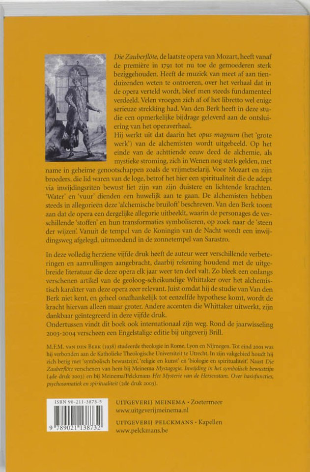 Die Zauberflöte, de laatste opera van Mozart, heeft vanaf de première in 1791 tot nu toe de gemoederen sterk beziggehouden. Heeft de muziek van meet af aan tienduizenden weten te ontroeren, over het verhaal dat in de opera verteld wordt, bleef men steeds fundamenteel verdeeld. Velen vroegen zich af of het libretto wel enige serieuze strekking had. Van den Berk heeft in deze studie een opmerkelijke bijdrage geleverd aan de ontsluiering van het operaverhaal. Hij werkt uit dat daarin het opus magnum (het grote werk) van de alchemisten wordt uitgebeeld. Op het einde van de achttiende eeuw deed de alchemie, als mystieke stroming, zich in Wenen nog sterk gelden, met name in geheime genootschappen zoals de vrijmetselarij. Voor Mozart en zijn broeders, die lid waren van de loge, betrof het hier een spiritualiteit die de adept via inwijdingsriten bewust liet zijn van zijn duistere en lichtende krachten. Wateren vuur dienden een huwelijk aan te gaan. De alchemisten hebben steeds in allegorieën deze alchemische bruiloft beschreven. Van den Berk toont aan dat de opera een dergelijke allegorie uitbeeldt, waarin de personages de verschillende stoffen en hun transformaties symboliseren, op zoek naar de steen der wijzen. Vanuit de tempel van de Koningin van de Nacht wordt een inwijdingsweg afgelegd, uitmondend in de zonnetempel van Sarastro. In deze volledig herziene vijfde druk heeft de auteur weer verschillende verbeteringen en aanvullingen aangebracht, daarbij rekening houdend met de uitgebreide literatuur die deze opera elk jaar weer ten deel valt. Zo bleek een onlangs verschenen artikel van de geoloog-scheikundige Whittaker over het alchemis tisch karakter van deze opera zeer relevant. Juist omdat hij de studie van Van den Berk niet kent, en geheel onafhankelijk tot eenzelfde hypothese komt, wordt de kracht hiervan alleen maar groter. Andere accenten die Whittaker uitwerkt, zijn dankbaar geïntegreerd in deze vijfde druk. Ondertussen vindt dit boek ook internationaal zijn weg. Rond de jaarwisseling 2003-2004 verscheen een Engelstalige editie bij uitgeverij Brill. M.F.M. van den Berk (1938) studeerde theologie in Rome, Lyon en Nijmegen. Tot eind 2001 was hij verbonden aan de Katholieke Theologische Universiteit te Utrecht. In zijn vakgebied houdt hij zich bezig met symbolisch bewustzijn, religie en kunst en biologie en spiritualiteit. Naast Die Zauberfl öte verschenen van hem bij Meinema Mystagogie. Inwijding in het symbolisch bewustzijn (4de druk 2003) en bij Meinema/Pelckmans Het Mysterie van de Hersenstam. Over basisfuncties, psychosomatiek en spiritualiteit (2de druk 2003).