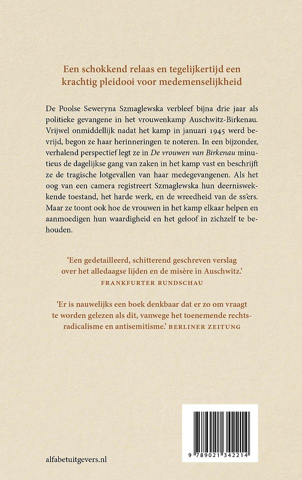 De Poolse Seweryna Szmaglewska bracht bijna drie lange jaren door als politieke gevangene in het vrouwenkamp Auschwitz-Birkenau. Vrijwel onmiddellijk nadat het kamp in januari 1945 werd bevrijd, begon ze haar herinneringen te noteren. Haar relaas, De vrouwen van Birkenau, zou later een belangrijke getuigenis worden tijdens het Neurenbergproces. In een bijzonder verhalend perspectief, namelijk zonder de ik-vorm te gebruiken, legt ze minutieus de dagelijkse gang van zaken in het kamp vast en beschrijft ze de tragische lotgevallen van haar mede gevangenen. Zo is er de actrice uit Vilnius die zo prachtig kan vertellen, het meisje uit Thessaloniki met haar droevige liedjes en het vrouwenorkest dat geleid wordt door een Nederlandse dirigente. Als het oog van een camera registreert Szmaglewska de deerniswekkende toestand van de gevangenen, het harde werk en de wreedheid van de SSers. Maar ze toont ook hoe de vrouwen in het kamp elkaar helpen en aanmoedigen hun waardigheid en het geloof in zichzelf te behouden. De vrouwen van Birkenau is een schokkend relaas en tegelijkertijd een krachtig pleidooi voor medemenselijkheid.