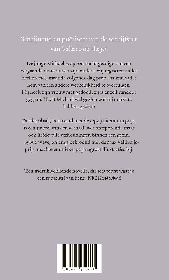 De ochtend valt, bekroond met de Opzij Literatuurprijs, is een juweel van een verhaal over ontsporende maar ook liefdevolle verhoudingen binnen een gezin. Sylvia Weve, onlangs bekroond met de Max Velthuijsprijs, maakte er unieke, paginagrote illustraties bij.