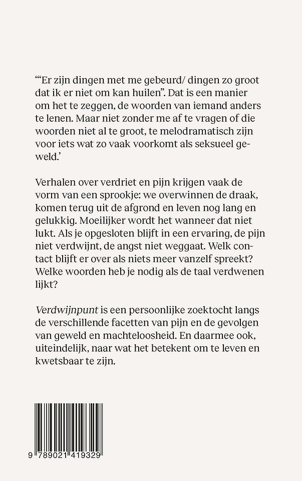 Verdwijnpunt is een persoonlijke zoektocht langs de verschillende facetten van pijn en de gevolgen van geweld en machteloosheid. En daarmee ook, uiteindelijk, naar wat het betekent om te leven en kwetsbaar te zijn.