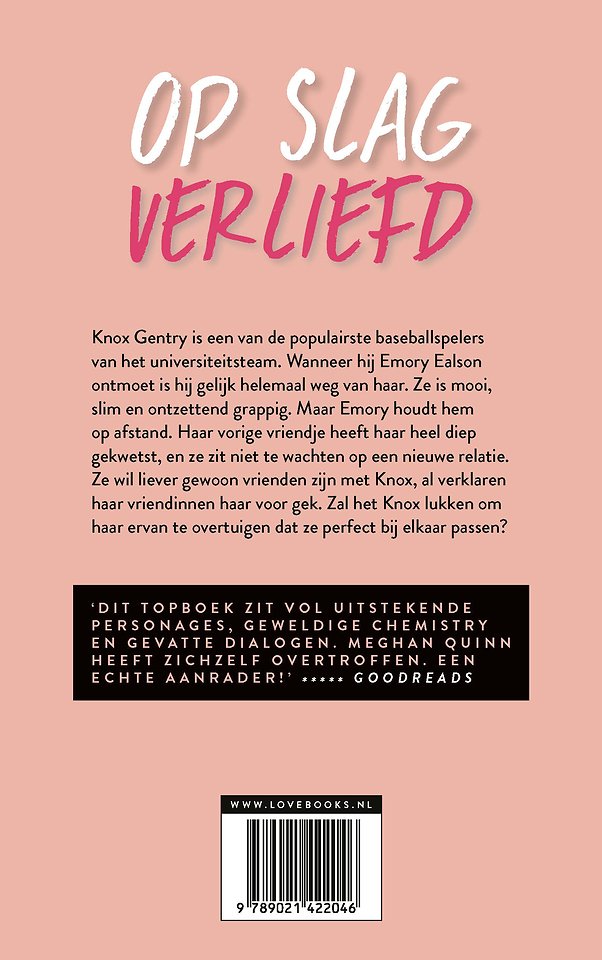 ‘Meghan Quinn heeft mij absoluut positief weten te verrassen. De personages bevatten diepgang en zelfspot maar laten ook hun kwetsbare kant zien. Bovendien bevat het verhaal een verrassende wending. Op slag verliefd is een echte aanrader voor iedereen die van het genre New Adult houdt!’ – @jenniferleest