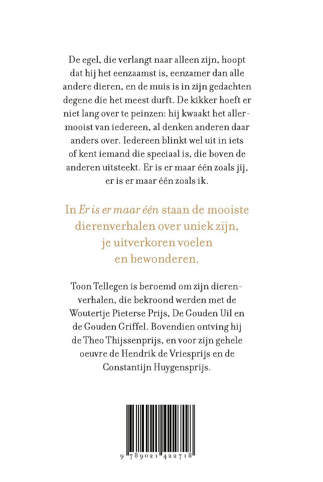 De egel, die verlangt naar alleen zijn, hoopt dat hij het eenzaamst is, eenzamer dan alle andere dieren, en de muis is in zijn gedachten degene die het meest durft. De kikker hoeft er niet lang over te peinzen: hij kwaakt het allermooist van iedereen, al denken anderen daar anders over. Iedereen blinkt wel uit in iets of kent iemand die speciaal is, die boven de anderen uitsteekt. Er is er maar één zoals jij, er is er maar één zoals ik.