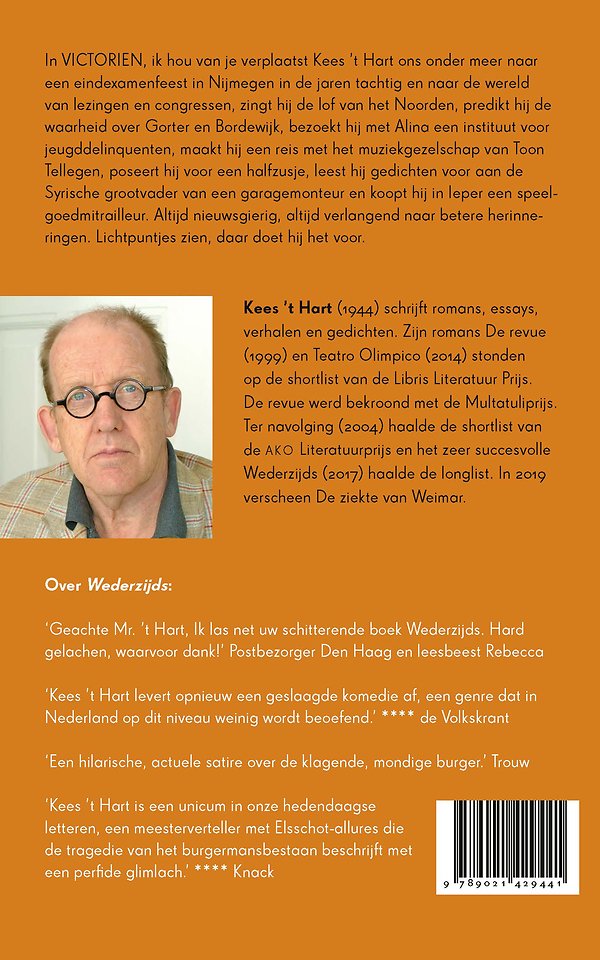 In VICTORIEN, ik hou van je verplaatst Kees ’t Hart ons onder meer naar een eindexamenfeest in Nijmegen in de jaren tachtig en naar de wereld van lezingen en congressen, zingt hij de lof van het Noorden, predikt hij de waarheid over Gorter en Bordewijk, bezoekt hij met Alina een instituut voor jeugddelinquenten, maakt hij een reis met het muziekgezelschap van Toon Tellegen, poseert hij voor een halfzusje, leest hij gedichten voor aan de Syrische grootvader van een garagemonteur en koopt hij in Ieper een speelgoedmitrailleur. Altijd nieuwsgierig, altijd verlangend naar betere herinneringen. Lichtpuntjes zien, daar doet hij het voor.