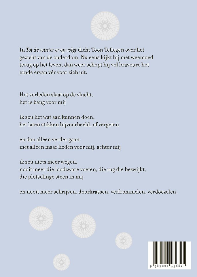 In Tot de winter er op volgt dicht Toon Tellegen over het gezicht van de ouderdom. Nu eens kijkt hij met weemoed terug op het leven, dan weer schopt hij vol bravoure het einde ervan vér voor zich uit.