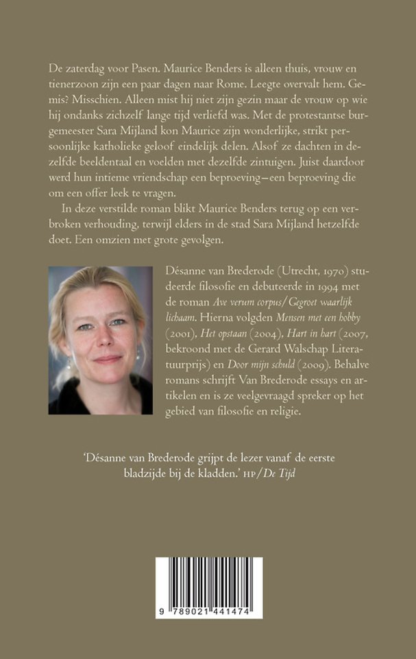 De zaterdag voor Pasen. Maurice Benders is alleen thuis, vrouw en tienerzoon zijn een paar dagen naar Rome. Leegte overvalt hem. Gemis? Misschien. Alleen mist hij niet zijn gezin maar de vrouw op wie hij ondanks zichzelf jarenlang verliefd was. Met de protestantse burgemeester Sara Mijland kon Maurice zijn wonderlijke, strikt persoonlijke katholieke geloof eindelijk delen. Alsof ze dachten in dezelfde beeldentaal en voelden met dezelfde zintuigen. Juist daardoor werd hun intieme vriendschap een beproeving - een beproeving die om een offer leek te vragen.