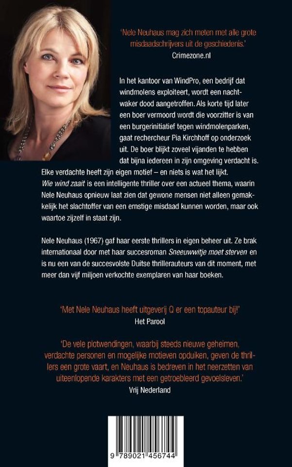 Wie wind zaait is een intelligente thriller over een actueel thema, waarin Nele Neuhaus opnieuw laat zien dat gewone mensen niet alleen heel gemakkelijk het slachtoffer van een ernstige misdaad kunnen worden, maar dat ze ook in staat zijn om een bloedige moord te plegen.