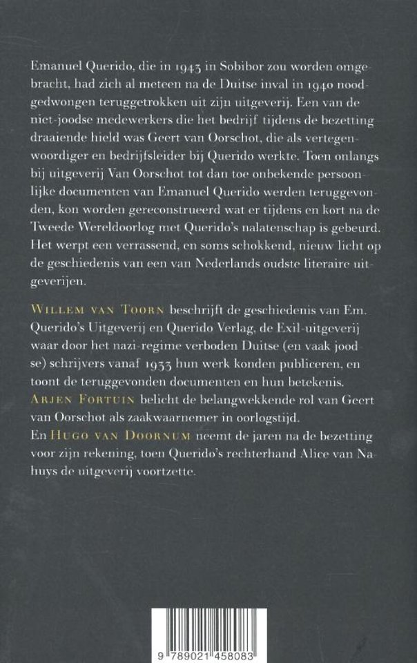 Willem van Toorn beschrijft de geschiedenis van Querido Verlag, waar Duits-joodse schrijvers vanaf de jaren dertig hun werk konden publiceren. Arjen Fortuin belicht de rol van Geert van Oorschot als zaakwaarnemer in oorlogstijd. En Hugo van Doornum schetst de jaren na de bezetting, toen Querido s rechterhand Alice van Nahuys onverwacht de leiding nam.