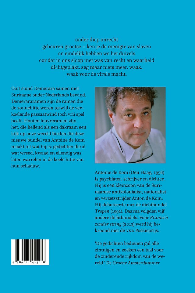 Ooit stond een deel van Demerara samen met Suriname onder Nederlands bewind. Demerararamen zijn de ramen die de zonnehitte weren terwijl de verkoelende passaatwind toch vrij spel heeft. Houten louvreramen zijn het, die hellend als een dakraam een kijk op onze wereld bieden die deze nieuwe bundel van Antoine de Kom maakt tot wat hij is: gedichten die al wat wreed, kwaad en ellendig was laten warrelen in de koele hitte van hun schaduw.