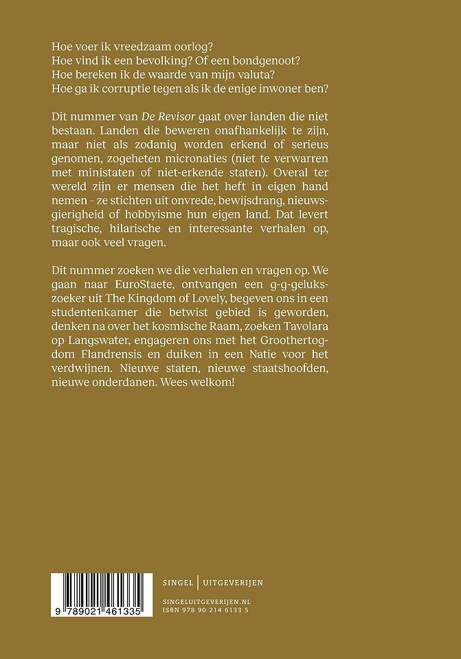 Dit nummer van De Revisor gaat over landen die niet bestaan. Landen die beweren onafhankelijk te zijn, maar niet als zodanig worden erkend of serieus genomen, zogeheten micronaties (niet te verwarren met ministaten of niet-erkende staten). Overal ter wereld zijn er mensen die het heft in eigen hand nemen – ze stichten uit onvrede, bewijsdrang, nieuwsgierigheid of hobbyisme hun eigen land. Dat levert tragische, hilarische en interessante verhalen op, maar ook veel vragen.