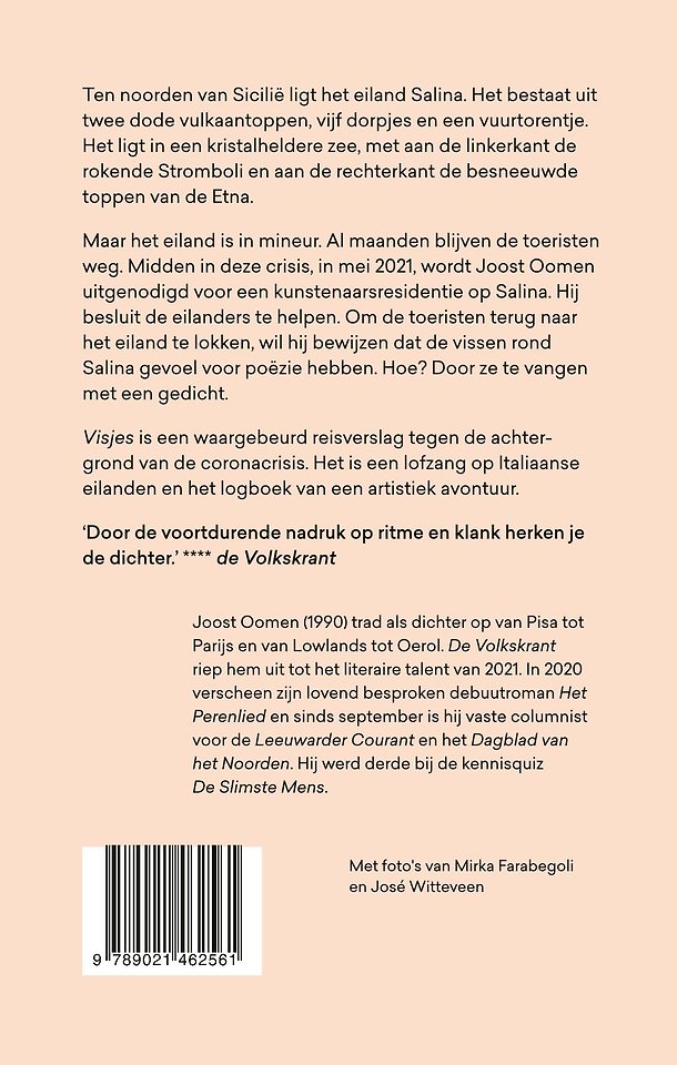 Visjes is een waargebeurd reisverslag tegen de achtergrond van de coronacrisis. Het is een lofzang op Italiaanse eilanden en het logboek van een artistiek avontuur.