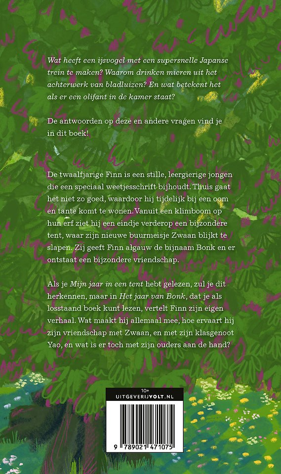 Als je Mijn jaar in een tent hebt gelezen, zul je dit herkennen, maar in Het jaar van Bonk, dat je als losstaand boek kunt lezen, vertelt Finn zijn eigen verhaal. Wat maakt hij allemaal mee, hoe ervaart hij zijn vriendschap met Zwaan, en met zijn klasgenoot Yao, en wat is er toch met zijn ouders aan de hand?