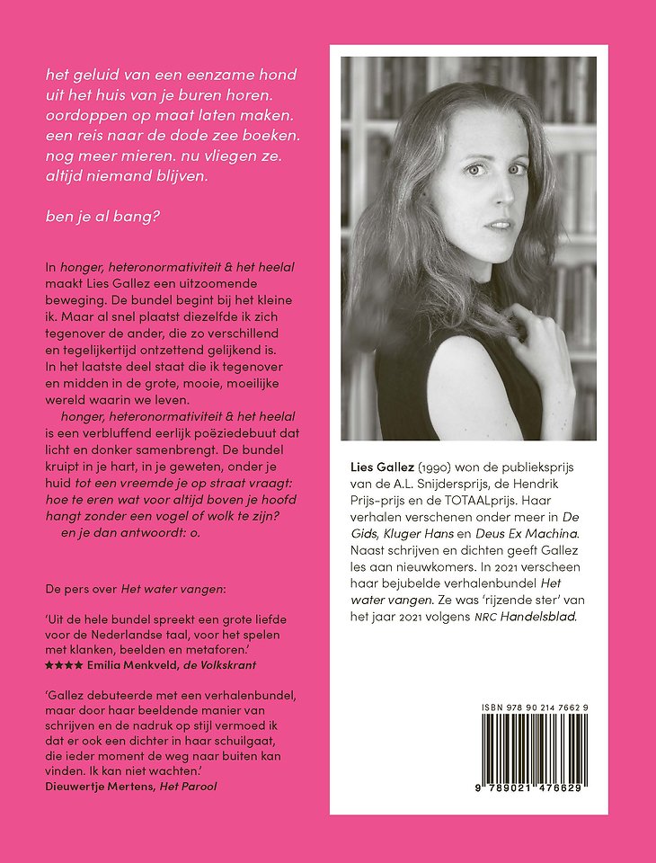 honger, heteronormativiteit & het heelal is een verbluffend eerlijk poëziedebuut dat licht en donker samenbrengt. De bundel kruipt in je hart, in je geweten, onder je huid tot een vreemde je op straat vraagt: hoe te eren wat voor altijd boven je hoofd hangt zonder een vogel of wolk te zijn?