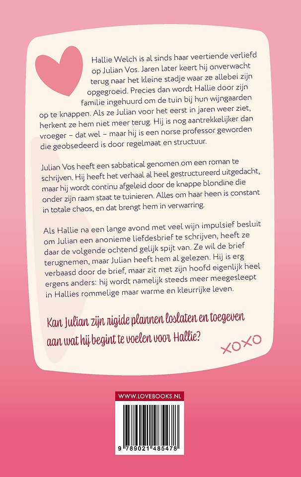 Hallie Welch is al sinds haar veertiende verliefd op Julian Vos. Jaren later keert hij onverwacht terug naar het kleine stadje waar ze allebei zijn opgegroeid. Precies dan wordt Hallie door zijn familie ingehuurd om de tuin bij hun wijngaarden op te knappen. Als ze Julian voor het eerst in jaren weer ziet, herkent ze hem niet meer terug. Hij is nog aantrekkelijker dan vroeger – dat wel – maar hij is een norse professor geworden die geobsedeerd is door regelmaat en structuur.