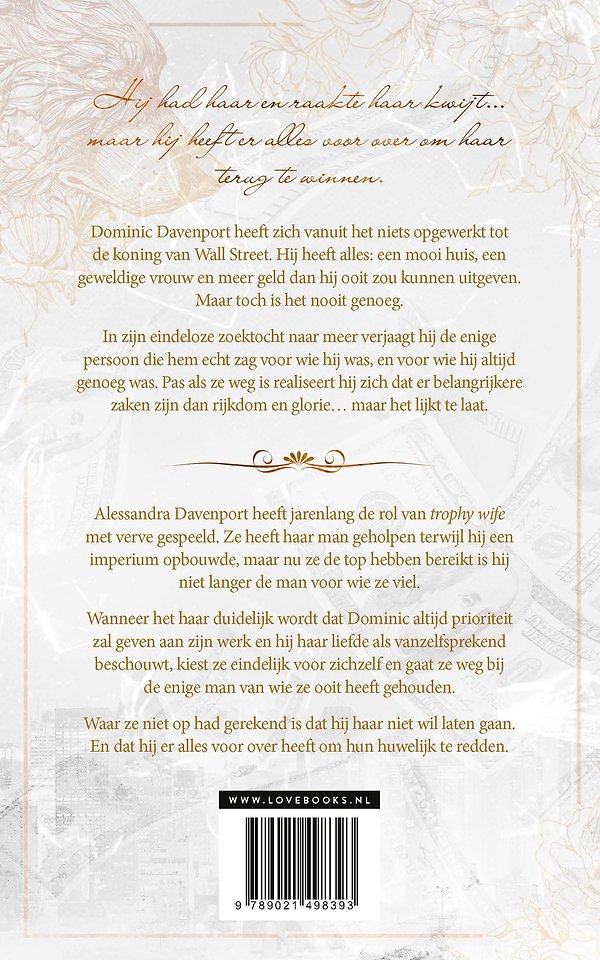 Alessandra Davenport heeft jarenlang de rol van trophy wife met verve gespeeld. Ze heeft haar man geholpen terwijl hij een imperium opbouwde, maar nu ze de top hebben bereikt is hij niet langer de man voor wie ze viel.