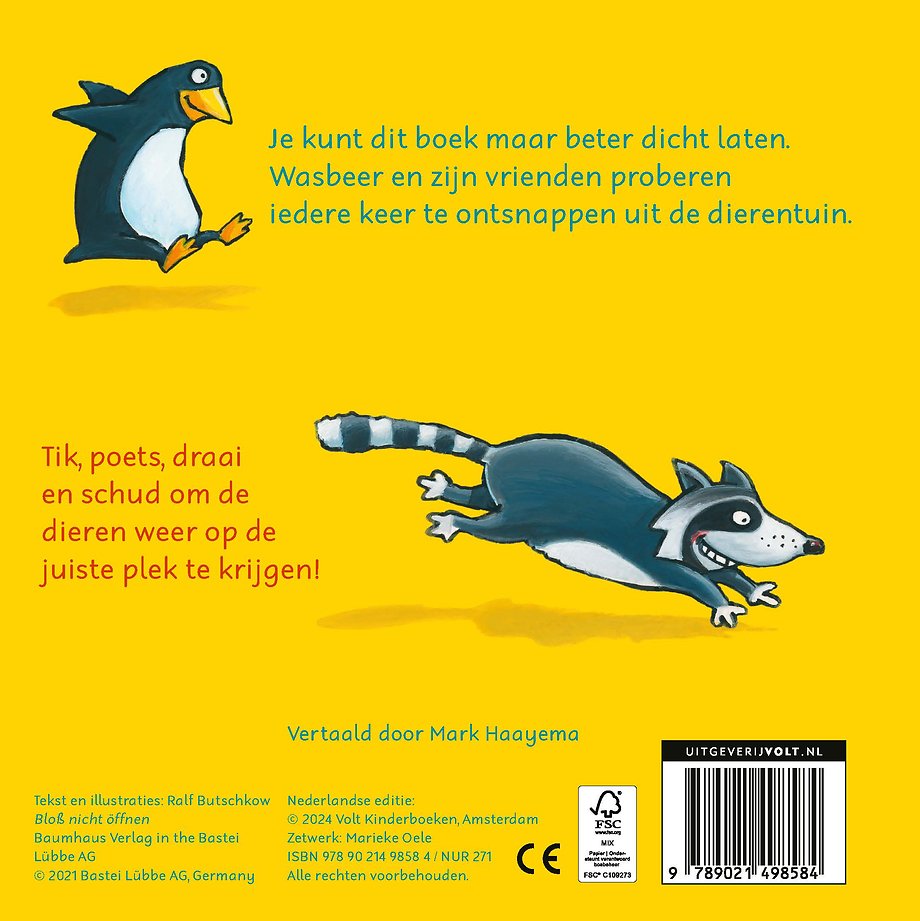 Je kunt dit boek maar beter niet opendoen. Wasbeer en zijn vrienden staan te popelen om te ontsnappen! Beweeg dus maar niet, want voor je het weet rennen ze allemaal weg…