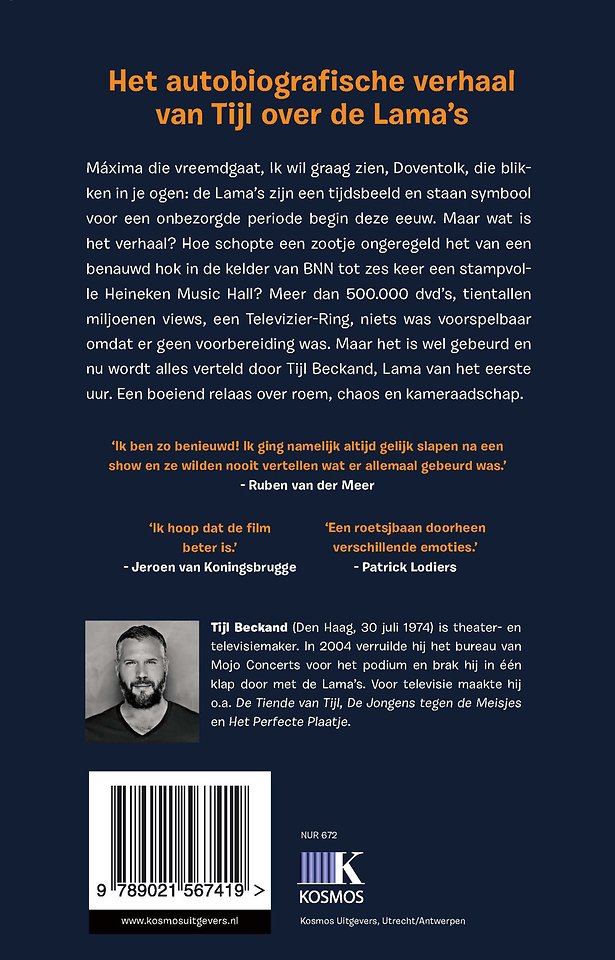Dit is het complete verhaal van de Lama's, verteld door Tijl Beckand. Máxima die vreemdgaat, Ik wil graag zien, Doventolk, 'die blikken in je ogen': de Lama's zijn een tijdsbeeld en staan symbool voor een onbezorgde periode begin deze eeuw. Maar wat is hun verhaal? Hoe schopte een zootje ongeregeld het van een benauwd hok in de kelder van BNN tot zes keer een stampvolle Heineken Music Hall? Meer dan 500.000 dvd's, tientallen miljoenen views, een Televizier-Ring, niets was voorspelbaar omdat er geen voorbereiding was. Maar het is wel gebeurd en nu wordt alles verteld door Tijl Beckand, Lama van het eerste uur. Een boeiend relaas over roem, chaos en kameraadschap.