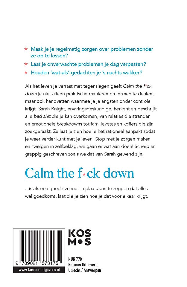 In 'Calm the f*ck' down maak je kennis met de NoWorries-methode van 'anti-goeroe' Sarah Knight. De auteur van bestsellers 'Don’t give a f*ck' en 'Get your sh*t together' helpt om je angsten te temmen en de controle over je leven terug te pakken. Maak je je regelmatig zorgen over problemen zonder ze op te lossen? Laat je onverwachte moeilijkheden je dag verpesten? Houden ‘wat als’-gedachten je ’s nachts wakker?