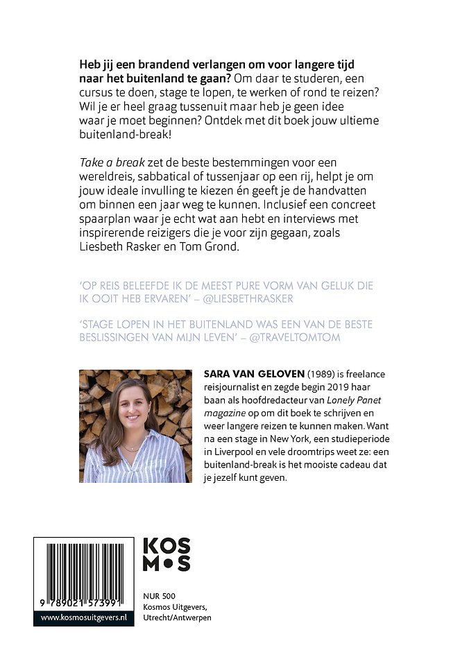 Take a break is het ultieme inspiratieboek voor iedereen die voor langere tijd naar het buitenland wil gaan. Of je nu bijvoorbeeld wil gaan backpacken, studeren, stagelopen of vrijwilligerswerk wil doen, Sara van Geloven geeft antwoord op alle praktische vragen die je daarover hebt. Sara is voormalig hoofdredacteur van Lonely Planet magazine en geeft vele leuke tips en voorbeelden voor een perfecte break of tussenjaar. Ze legt uit hoe je een spaarplan maakt, alle nodige voorbereidingen treft en binnen een jaar op reis kunt. Met advies van bekende reisspecialisten als Liesbeth Rasker, Joshua van Eijndhoven en Tom Grond (@traveltomtom).