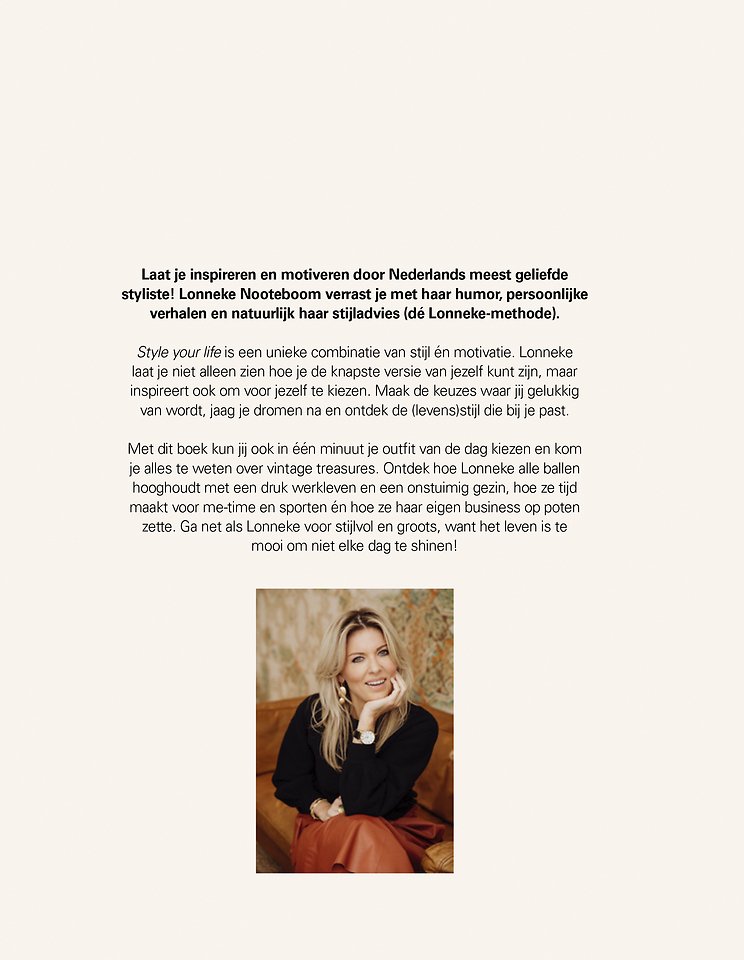 Style your life van Lonneke Nooteboom is een unieke combinatie van stijlgids én motivatiehandboek. De fashion en celebrity styliste laat met dit boek niet alleen zien hoe je de knapste versie van jezelf kunt zijn, maar inspireert ook om voor jezelf te kiezen.