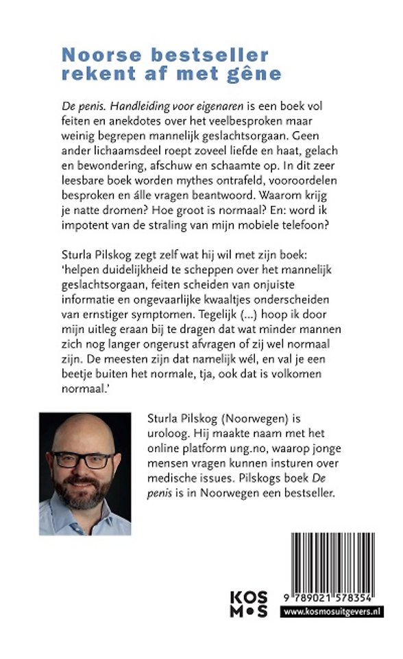 De penis. Handleiding voor eigenaren staat boordevol feiten, anekdotes en inzichten over de veelbesproken maar weinig begrepen penis. Geen ander lichaamsdeel roept bij mensen zoveel liefde en haat, gelach en bewondering, afschuw en schaamte op. Maar met dit boek verandert dat. Deze Noorse bestseller van bekende uroloog Sturla Pilskog rekent voor altijd af met gêne en ongemak. In dit fascinerende en zeer leesbare boek worden mythes ontrafeld, vooroordelen besproken en álle vragen die je ooit over de penis hebt gehad, helder beantwoord. Waarom krijg je natte dromen? Hoe groot is normaal? En: word ik impotent van de straling van mijn mobiele telefoon?