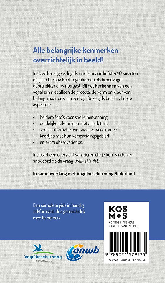 Met de ANWB Vogelgids van Volker Dierschke weet je altijd het antwoord op de vraag Welke vogel is dat? Een ontzettend handige zakgids om de meest voorkomende soorten vogels te determineren. Alle belangrijke kenmerken zijn overzichtelijk in beeld gebracht met heldere foto’s voor een snelle herkenning en duidelijke tekeningen voor de kenmerkende details. Heel geschikt voor gebruik bij excursies, onderweg in Nederland of op vakantie in Europa. Deze gids bevat meer dan 440 Europese vogelsoorten.