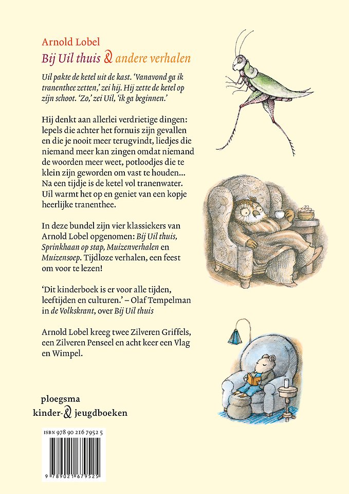 In deze bundel zijn vier klassiekers van Arnold Lobel opgenomen: Bij Uil thuis, Sprinkhaan op stap, Muizenverhalen en Muizensoep. Tijdloze verhalen, een feest om voor te lezen!