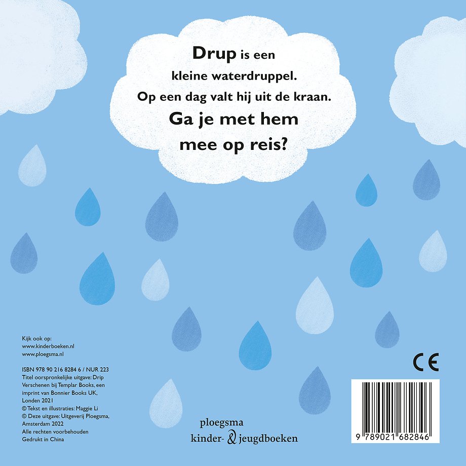In dit kartonboek met stans volg je de weg van Drup van kraan naar riool en van rivier naar zee. Daar verandert hij in een wolk, waarna hij in de vorm van regen… weer een losse druppel wordt!