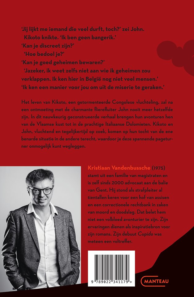 Het leven van Kikoto, een getormenteerde Congolese vluchteling, zal na een ontmoeting met de charmante flierefluiter John nooit meer hetzelfde zijn. In dit nauwkeurig geconstrueerde verhaal brengen hun avonturen hen van de Vlaamse kust tot in de prachtige Italiaanse Dolomieten. Kikoto en John, vluchtend en tegelijkertijd op zoek, komen op hun tocht van de ene benarde situatie in de andere terecht, waardoor je deze spannende pageturner onmogelijk kunt wegleggen.