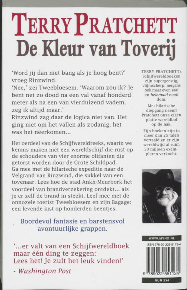 ‘Nee,’ zei Tweebloesem. ‘Waarom zou ik? Je bent net zo dood na een val vanaf honderd meter als na een van vierduizend vadem, zeg ik altijd maar.’