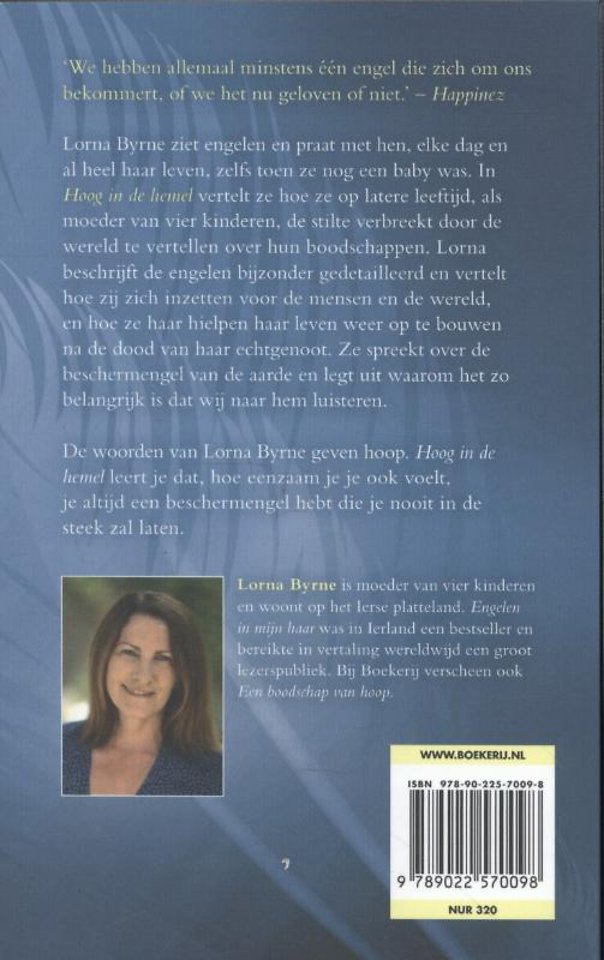 Lorna Byrne ziet engelen en praat met hen, elke dag en al heel haar leven. In Hoog in de hemel vertelt ze hoe ze na de dood van haar man alleen voor de opvoeding van de kinderen kwam te staan, totdat de engelen haar zeiden dat ze de stilte moest doorbreken en de wereld moest vertellen over de boodschappen van de engelen en hoe zij zich met tome-loze liefde inzetten voor iedereen.