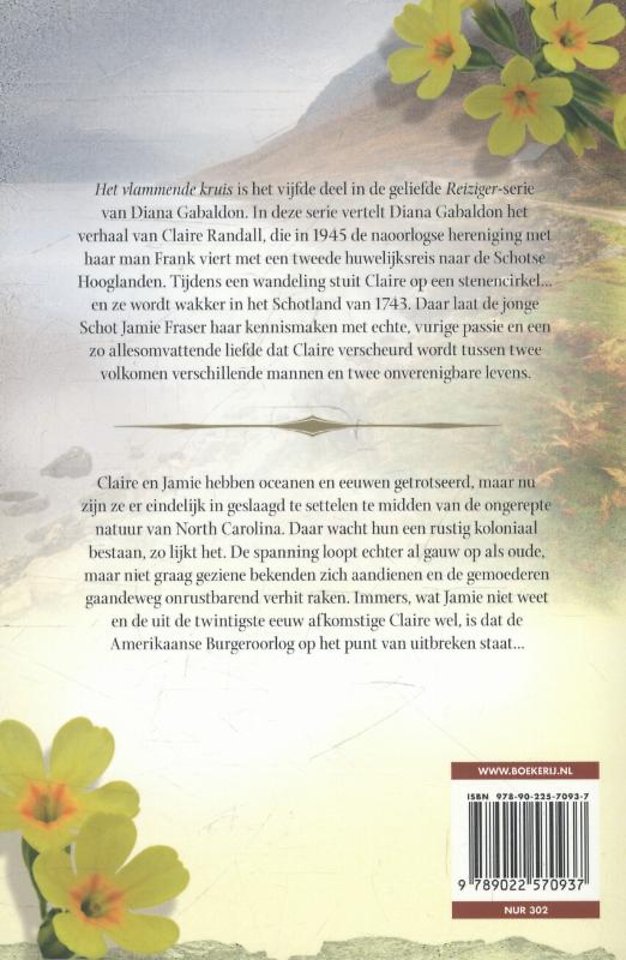 Het vlammende kruis is het vijfde deel in de geliefde Reiziger-serie van Diana Gabaldon. In deze serie vertelt Diana Gabaldon het verhaal van Claire Randall, die in 1945 de naoorlogse hereniging met haar man Frank viert met een tweede huwelijksreis naar de Schotse Hooglanden. Tijdens een wandeling stuit Claire op een stenencirkel… en ze wordt wakker in het Schotland van 1743. Daar laat de jonge Schot Jamie Fraser haar kennismaken met echte, vurige passie en een zo allesomvattende liefde dat Claire verscheurd wordt tussen twee volkomen verschillende mannen en twee onverenigbare levens.