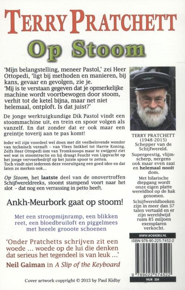 Op Stoom, het nieuwste deel in de onovertroffen Schijfwereld-reeks, tjoekt stomend voort naar het slot (dat nog een verrassinkje voor ons in petto heeft). Weer boordevol oude bekenden, slimme grappen en hartverwarmende belevenissen van lieden die moeten optornen tegen vooroordeel en onbenul.