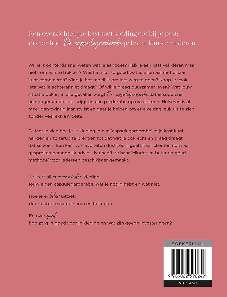 Een overzichtelijke kast met kleding die bij je past: ervaar hoe De capsulegarderobe je leven kan veranderen. Leoni Huisman is al meer dan 20 jaar stylist en gaat je helpen om er elke dag leuk uit te zien zonder veel extra moeite. Ze helpt je met jouw kleding elk seizoen in een ‘capsulegarderobe’ in je kast te hangen en zo terug te brengen tot dat wat je draagt. Leoni geeft haar cliënten normaal gesproken persoonlijk advies. Nu heeft ze haar ‘Minder en beter en goed-methode’ voor iedereen beschikbaar gemaakt. Je leert alles over: minder kleding: jouw eigen capsulegarderobe, wat je nodig hebt en wat niet. Hoe je er beter uitziet: door beter te combineren en te kopen. En over goed: hoe zorg je goed voor je kleding en wat zijn goede investeringen?