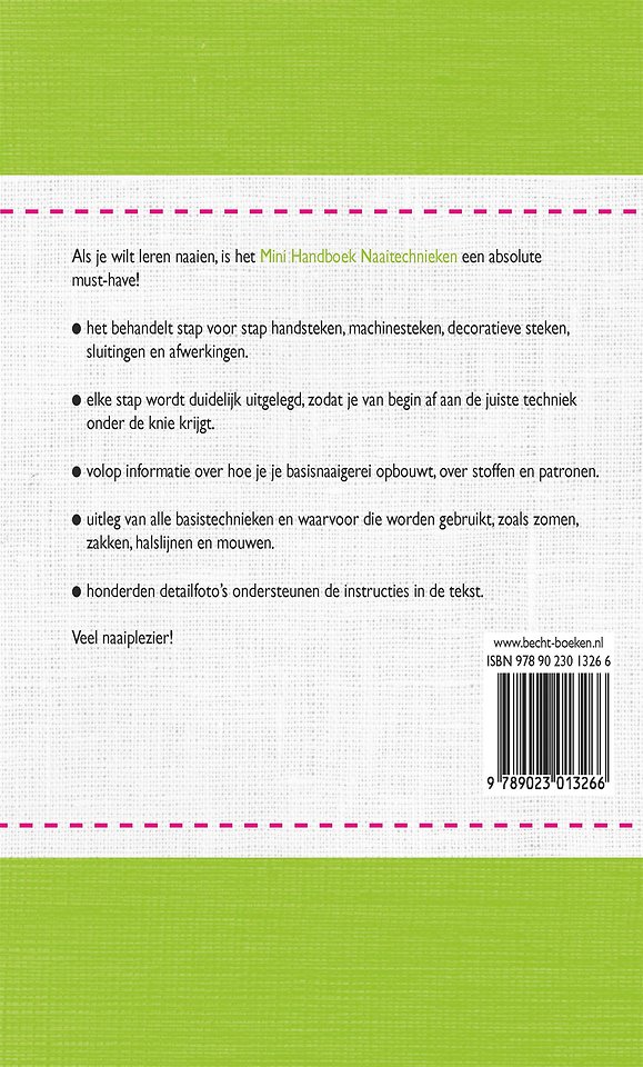 Als je wilt leren naaien, is het 'Mini handboek naaitechnieken' een absolute must-have. Na het enorme succes van de grote gebonden editie van 'Handboek naaitechnieken' is het nu tijd voor een kleine en goedkopere editie voor degenen die nog maar net begonnen zijn met hun eerste stappen op naaigebied. De handzame paperbackeditie behandelt stap voor stap handsteken, machinesteken, decoratieve steken, sluitingen en afwerkingen. Elke stap wordt duidelijk uitgelegd, zodat je van het begin af aan de juiste techniek aanleert.