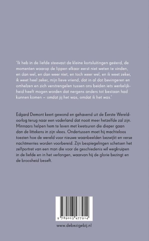Edgard Demont keert gewond en gehavend uit de Eerste Wereldoorlog terug naar een vaderland dat nooit meer hetzelfde zal zijn. Minnaars helpen hem te leven met kwetsuren die dieper gaan dan de littekens in zijn vlees. Ondertussen moet hij machteloos toezien hoe de wereld voor nieuwe waanbeelden bezwijkt en verse nachtmerries worden voorbereid. Zijn bespiegelingen schetsen het zelfportret van een man die voor de geschiedenis wil wegkruipen in de liefde en in het verlangen, waarvan hij de glorie bezingt en de broosheid beseft.