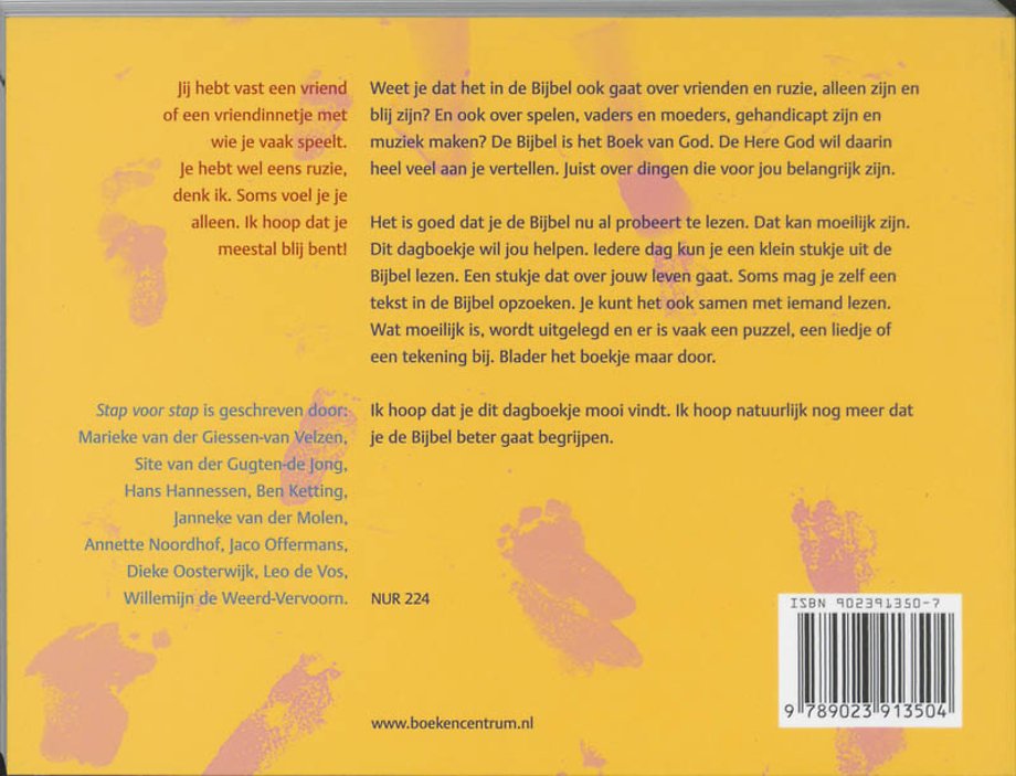 Jij hebt vast een vriend of een vriendinnetje met wie je vaak speelt. Je hebt wel eens ruzie, denk ik. Soms voel je je alleen. Ik hoop dat je meestal blij bent! Weet je dat het in de Bijbel ook gaat over vrienden en ruzie, alleen zijn en blij zijn? En ook over spelen, vaders en moeders, gehandicapt zijn en muziek maken? De Bijbel is het Boek van God. De Here God wil daarin heel veel aan je vertellen. Juist over dingen die voor jou belangrijk zijn. Het is goed dat je de Bijbel nu al probeert te lezen. Dat kan moeilijk zijn. Dit dagboekje wil jou helpen. Iedere dag kun je een klein stukje uit de Bijbel lezen. Een stukje dat over jouw leven gaat. Soms mag je zelf een tekst in de Bijbel opzoeken. Je kunt het ook samen met iemand lezen. Wat moeilijk is, wordt uitgelegd en er is vaak een puzzel, een liedje of een tekening bij. Blader het boekje maar door. Ik hoop dat je dit dagboekje mooi vindt. Ik hoop natuurlijk nog meer dat je de Bijbel beter gaat begrijpen. 'Stap voor stap' is geschreven door: Marieke van der Giessen-van Velzen, Site van der Gugten-de Jong, Hans Hannessen, Ben Ketting, Janneke van der Molen, Annette Noordhof, Jaco Offermans, Dieke Oosterwijk, Leo de Vos, Willemijn de Weerd-Vervoorn