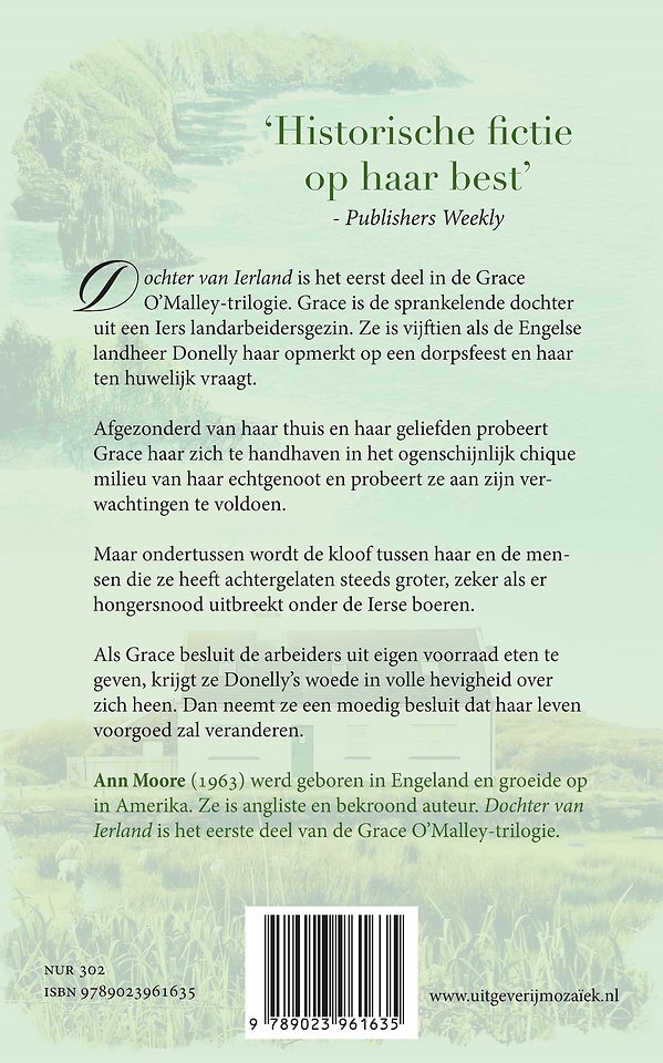 Dochter van Ierland van Ann Moore is het eerste deel in de Grace O’Malley-trilogie. Grace is de sprankelende dochter uit een Iers landarbeidersgezin. Ze is vijftien als de Engelse landheer Donelly haar opmerkt op een dorpsfeest en haar ten huwelijk vraagt.