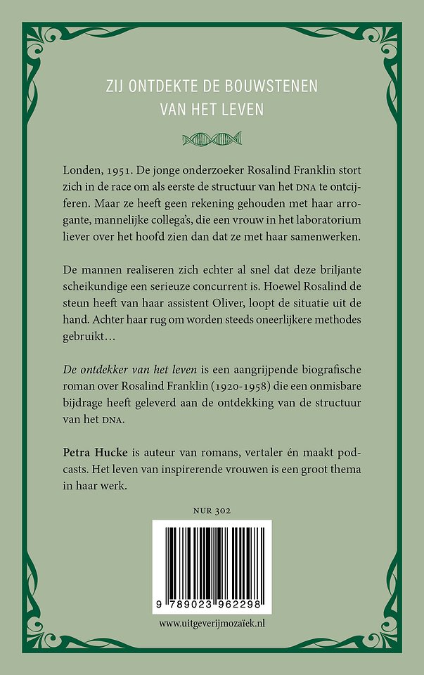 Londen, 1951. In De ondekker van het leven van Petra Hucke stort de jonge onderzoeker Rosalind Franklin (1920-1958) zich in de race om als eerste de structuur van DNA te ontcijferen. Maar ze heeft geen rekening gehouden met haar arrogante, mannelijke collega's, die een vrouw in het laboratorium liever over het hoofd zien dan dat ze met haar samenwerken.