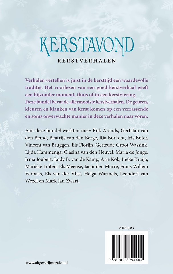 Aan deze kerstverhalenbundel werkten twintig auteurs mee, oude bekenden en nieuwe talenten, waaronder Arie Kok, Irma Joubert, Leendert van Wezel, Sandra van Tongeren, Ineke Kraijo, Els Florijn en Iris Boter.