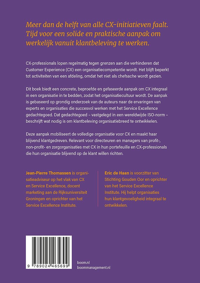 Dit boek biedt een concrete, beproefde en gefaseerde aanpak om CX integraal in een organisatie in te bedden, zodat het organisatiecultuur wordt. De aanpak is gebaseerd op grondig onderzoek van de auteurs naar de ervaringen van experts en organisaties die succesvol werken met het Service Excellence gedachtegoed. Dat gedachtegoed – vastgelegd in een wereldwijde ISO-norm – beschrijft wat nodig is om klantbeleving organisatiebreed te ontwikkelen.