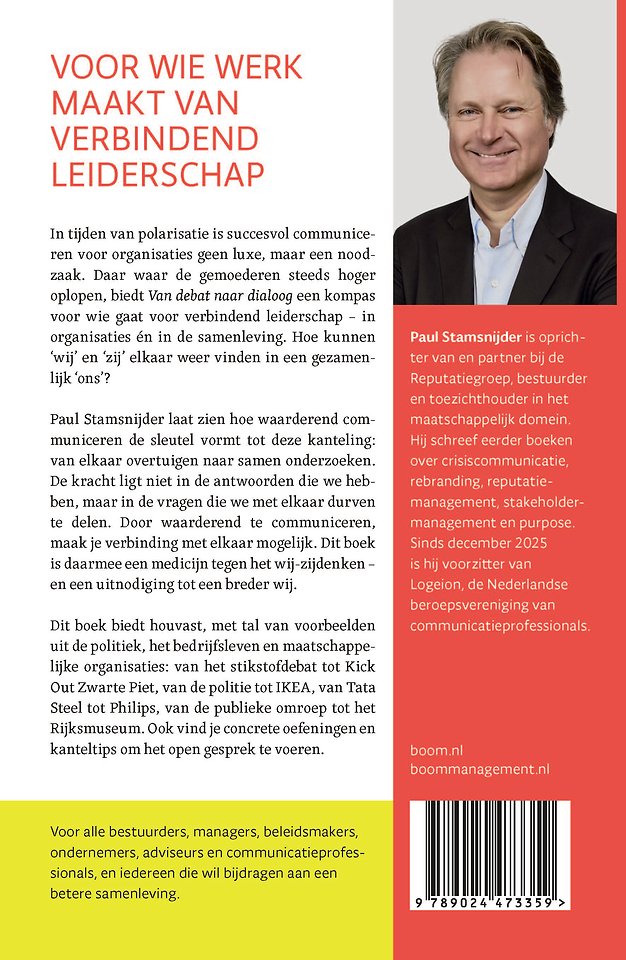 In tijden van polarisatie is succesvol communiceren voor organisaties geen luxe, maar een noodzaak. Daar waar de gemoederen steeds hoger oplopen, biedt Van debat naar dialoog een kompas voor wie gaat voor verbindend leiderschap – in organisaties én in de samenleving. Hoe kunnen ‘wij’ en ‘zij’ elkaar weer vinden in een gezamenlijk ‘ons’?