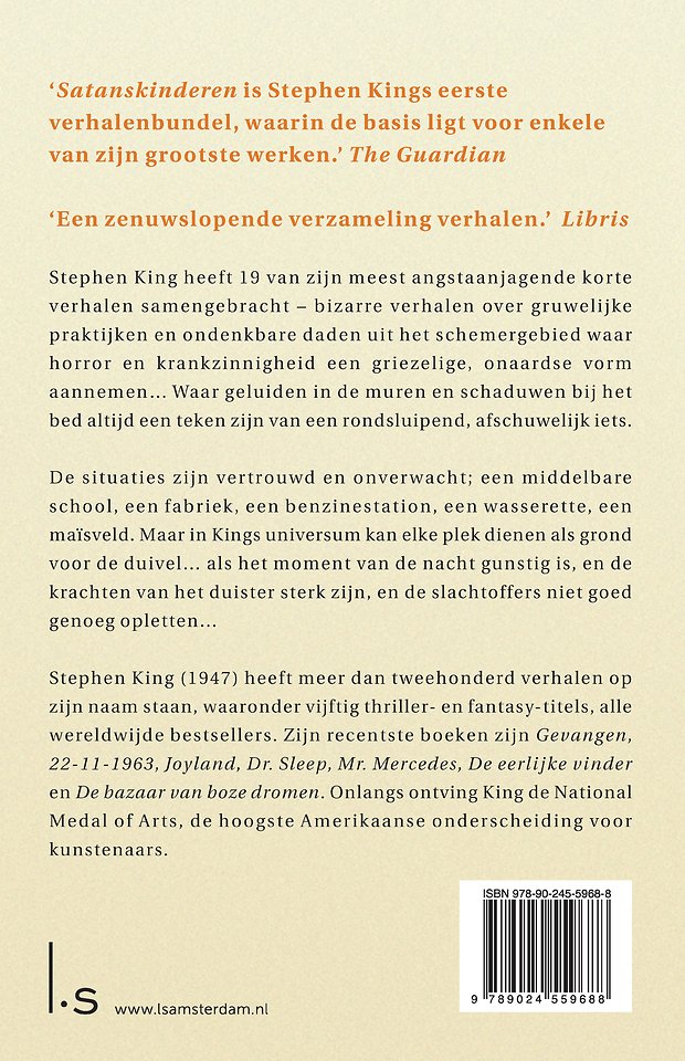 Satanskinderen van Stephen King is een huiveringwekkende verzameling korte verhalen waarvan er maar liefst zes verfilmd zijn, zoals The Mangler, Children of the Corn en The Lawnmower Man. King is een meester in het transformeren van doodgewone dingen naar ijzingwekkende voorwerpen uit je ergste nachtmerries. De situaties zijn vertrouwd: een school, een maïsveld, een wasserij, een wegrestaurant, een fabriek. Maar niets is wat het lijkt en als het uur van de nacht gunstig is en de kracht van het duister sterk is en de slachtoffers niet goed genoeg opletten, kan elke plek dienen als grond voor de duivel...