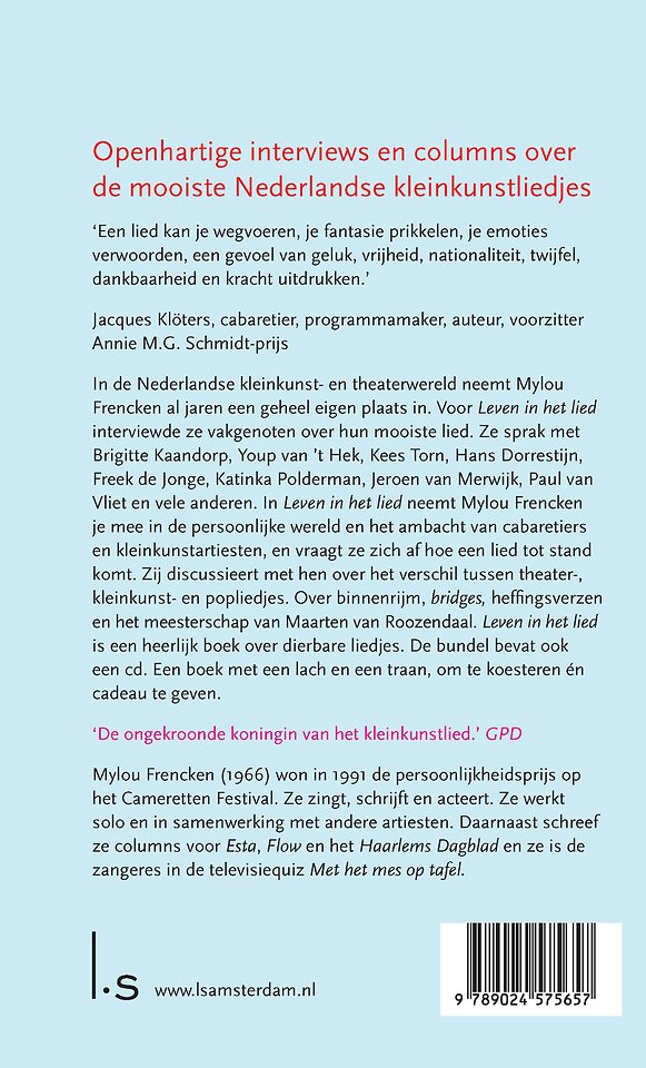 Mylou Frencken interviewt in Leven in het lied 25 bekende en minder bekende liedschrijvers, cabaretiers en theaterzangers over hun mooiste lied. Met Brigitte Kaandorp, Youp van 't Hek, Claudia de Breij, Paul van Vliet en vele anderen. Het boek bevat een cd met de liedjes.