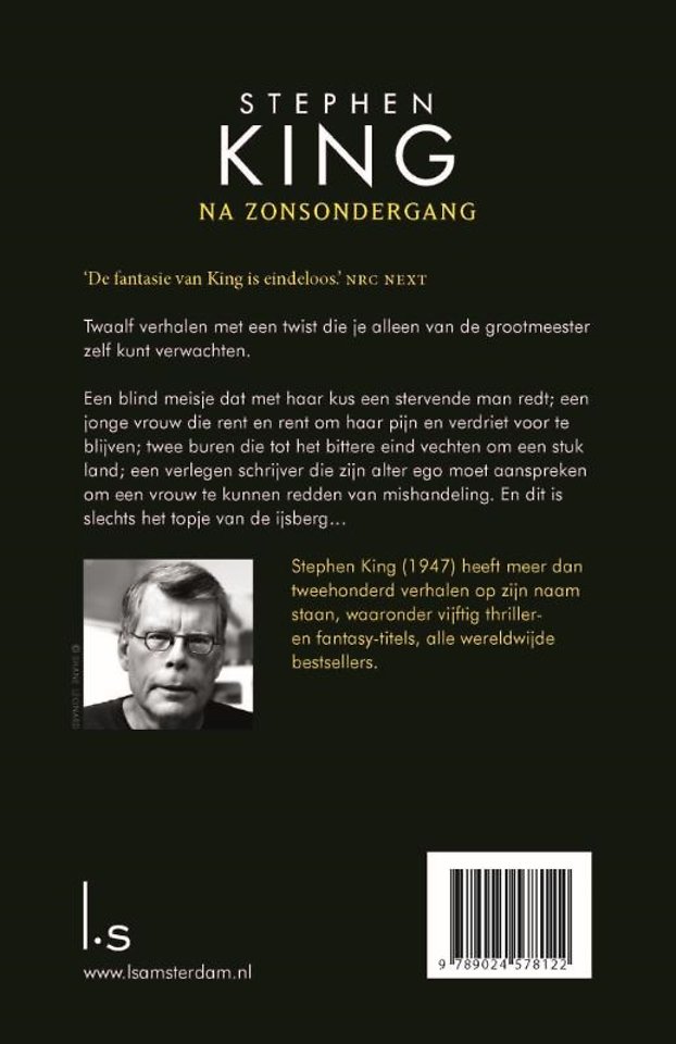 Na zonsondergang bevat dertien korte griezelverhalen van meesterverteller Stephen King. Ze verschenen o.a. in The New Yorker, Esquire, Playboy en The Paris Review.