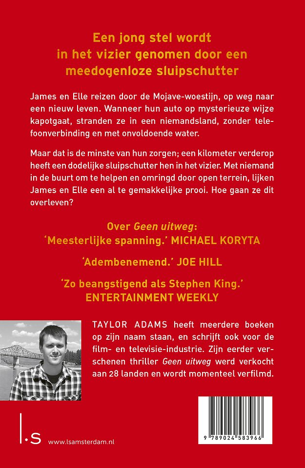 Hinderlaag van Taylor Adams is een razend spannende thriller voor de lezers van Stephen King en Lee Child. James en Elle Eversman zitten even zonder baan, zonder huis, een hebben net hun zesde miskraam gehad. Dus als hun Toyota het in het midden van de Mojave woestijn begeeft, lijkt het de zoveelste vorm van pech. Totdat James een kogelgat ontdekt in de motorkap.