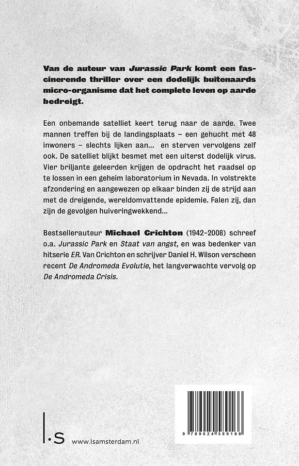 Bestsellerauteur Michael Crichton (1942-2008) schreef o.a. Jurassic Park en Staat van angst, en was bedenker van hitserie ER. Van Crichton en schrijver Daniel H. Wilson verscheen recent De Andromeda Evolutie, het langverwachte vervolg op De Andromeda Crisis.