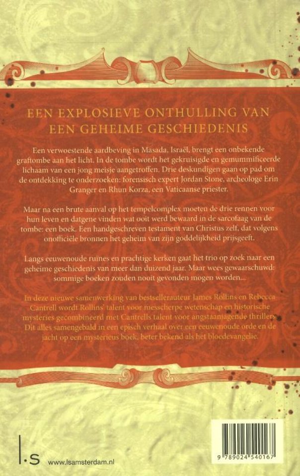 In deze nieuwe samenwerking van bestsellerauteur James Rollins en Rebecca Cantrell wordt Rollins talent voor messcherpe wetenschap en historische mysteries gecombineerd met Cantrells talent voor angstaanjagende thrillers. Dit alles samengebald in een episch verhaal over een eeuwenoude orde en de jacht op een mysterieus boek, beter bekend als het bloedevangelie.
