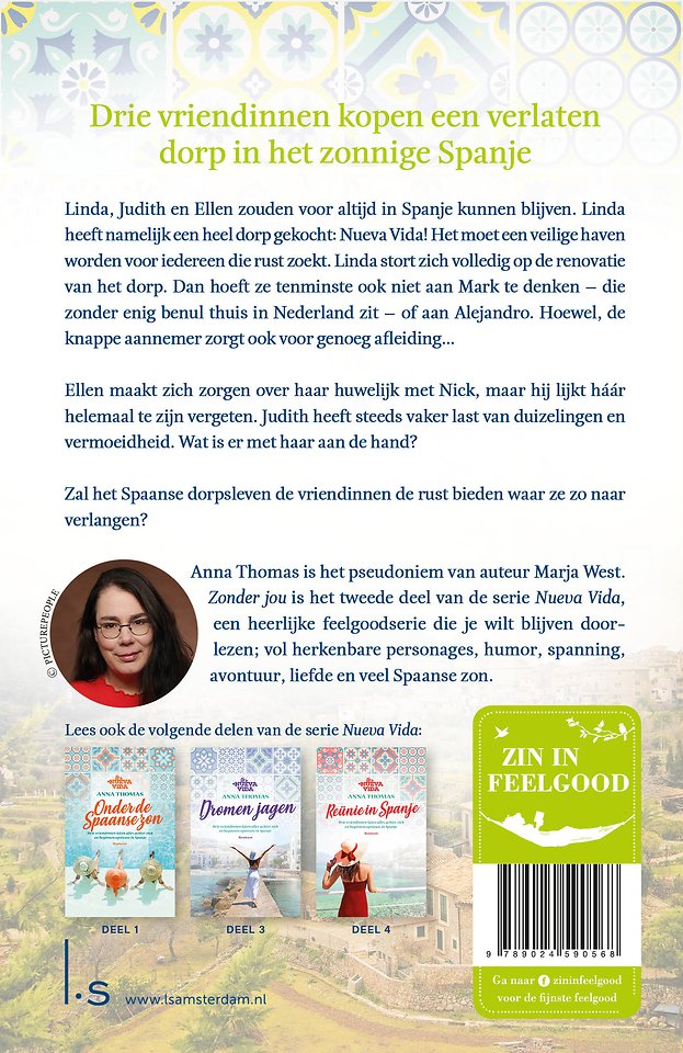 Anna Thomas is het pseudoniem van auteur Marja West. In 2015 viel ze op met haar debuut Uitgeteld, in 2016 gevolgd door Echte barkeepers heten Henk. Zonder jou is het tweede deel van haar nieuwe serie Nueva Vida.