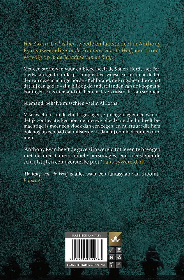 Het Zwarte Lied is het tweede deel in Anthony Ryans tweedelige In de Schaduw van de Wolf, een direct vervolg op In de Schaduw van de Raaf.