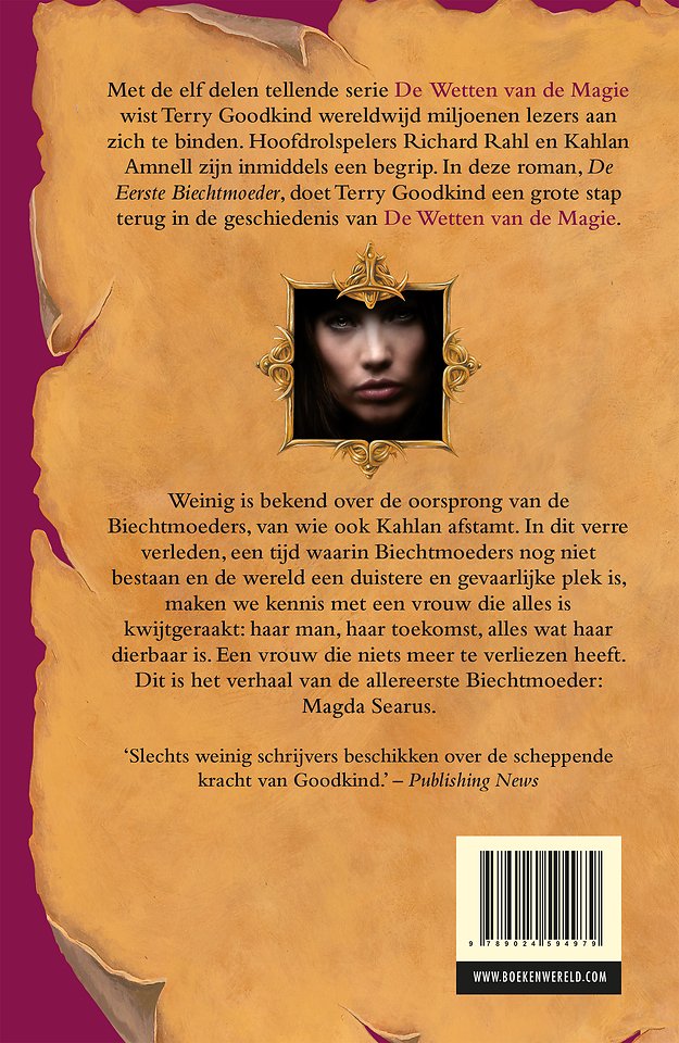 ... weinig is bekend over de oorsprong van de Biechtmoeders, van wie ook Kahlan afstamt. In dit verre verleden, een tijd waarin Biechtmoeders nog niet bestonden en de wereld een duistere en gevaarlijke plek was, maken we kennis met een vrouw die alles is kwijtgeraakt, haar man, haar toekomst, alles. Kortom, een vrouw die niets meer te verliezen heeft. Dit is het verhaal van de allereerste Biechtmoeder: Magda Searus.